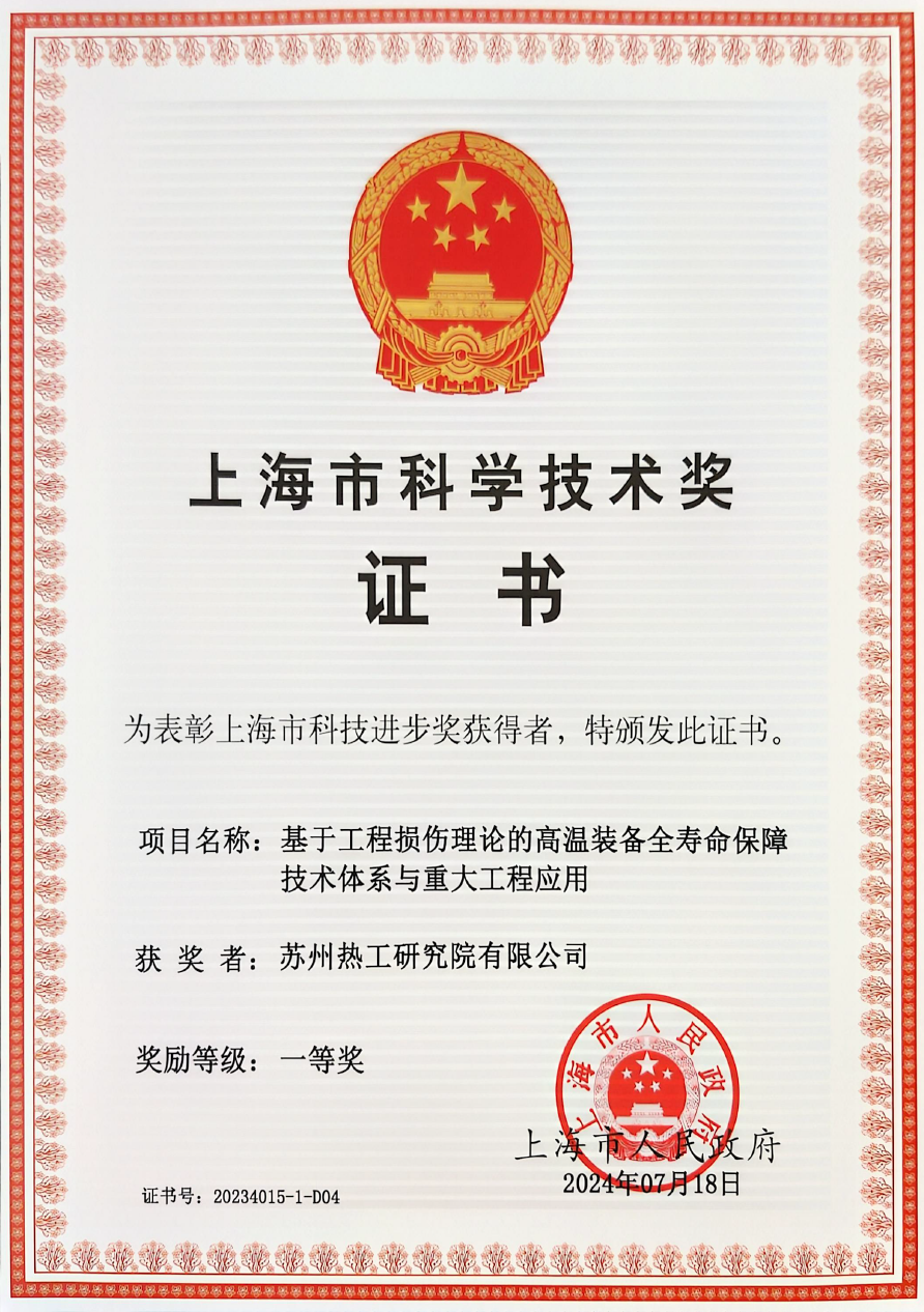 近日,上海市人民政府發布了《上海市人民政府關于2023年度上海市科學技術獎勵的決定》[滬府令8號]。蘇州熱工研究院有限公司聯合華東理工大學等單位申報的創新項目《基于工程損傷理論的高溫裝備全壽命保障技術體系與重大工程應用》,榮獲上海市科技進步一等獎。