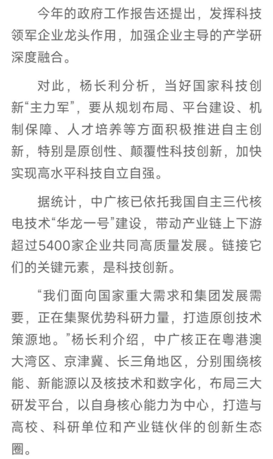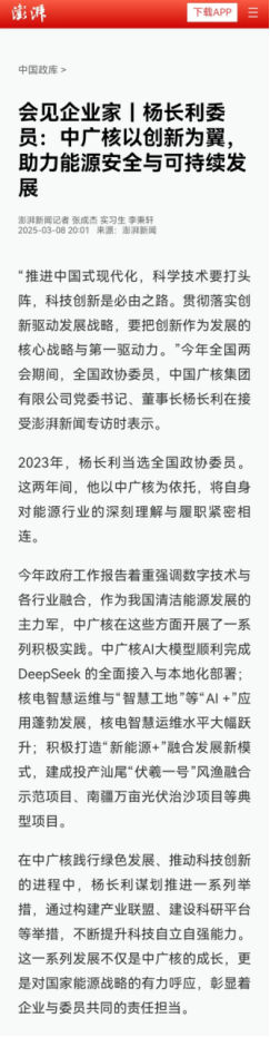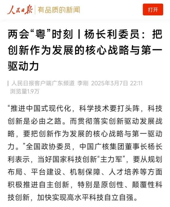 2025年全國兩會期間,全國政協委員、中國廣核集團有限公司黨委書記、董事長楊長利積極履職盡責,圍繞科技創新、清潔能源融合發展以及人工智能技術應用落地等熱點問題積極發聲,人民日報、新華社、中央廣播電視總臺新聞聯播、科技日報等多家媒體關注和報道,產生廣泛的社會影響。