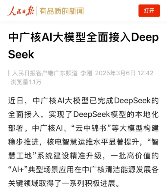 《新華財經》:人工智能是今年兩會期間的熱點話題。“中廣核AI大模型已完成DeepSeek的全面接入,實現了DeepSeek模型的本地化部署。同時,一系列核電特種機器人正在核電建造、運維等領域大顯身手?!睏铋L利說,后續中廣核將進一步探索人工智能與核電、新能源場景的深度融合,持續提升生產安全與效率。